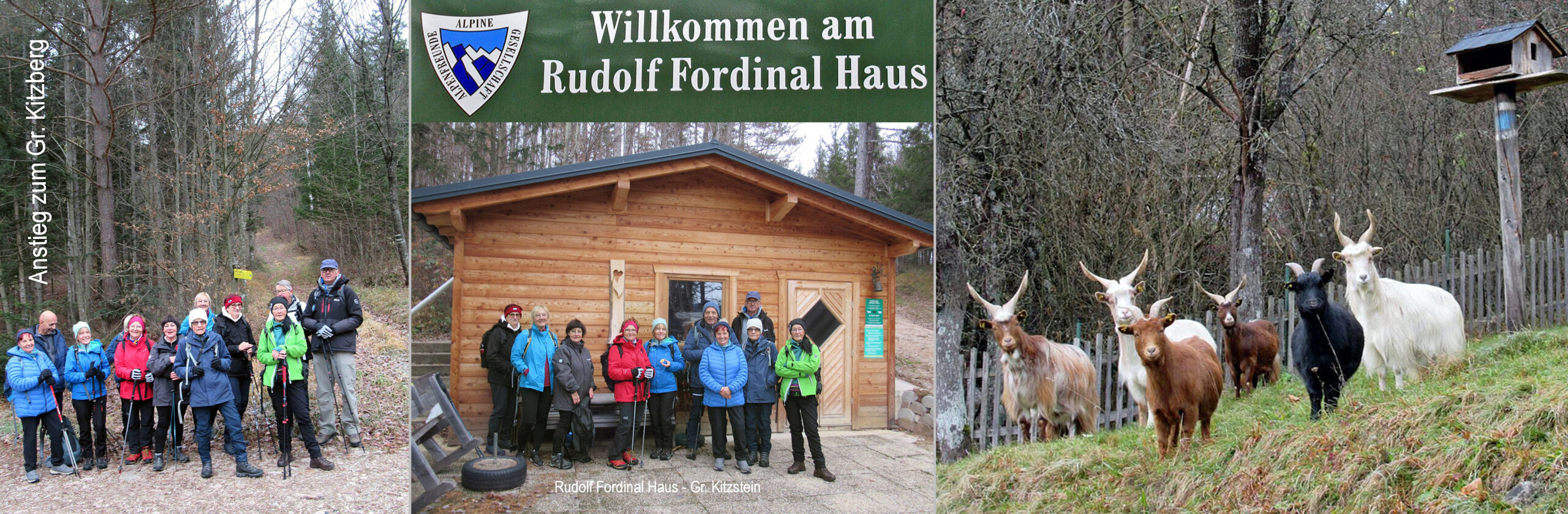Bahnfahrt mit Nervenkitzel, trotz Verspätung erreichen wir den Zug nach Pernitz. Über uns ein niederschlagsfreier Wolkenhimmel, vor uns der Große Kitzberg, unter uns gefrorener Boden. In Serpentinen windet sich der Forstweg hinauf, dann ein steiler Steig und zum Rudolf-Fordinal-Haus geht es schon wieder bergab. Rast. Über die Ochsenweide kommen wir in den Weidenbachgraben. Bei der alten Pecherei gibt es gegenseitiges Bestaunen, Ziegen sind es. Unmarkiert steigen wir den Pfad hinauf zur Hundsgrube, wo wir auf den Weg 01 zur Gauermannhütte treffen, wir aber folgen dem Hinweis zum Michlwirt, wo wir einkehren. Mit dem Blick auf die Balbersteine schmeckt gutes Essen noch viel besser. Der weitere Weg über Weidmannsfeld zur Bahn – ein Selbstläufer, die letzten Meter tatsächlich im Laufschritt, denn der Zug fährt ein und alle mit. Super – denn damit haben wir nicht gerechnet!