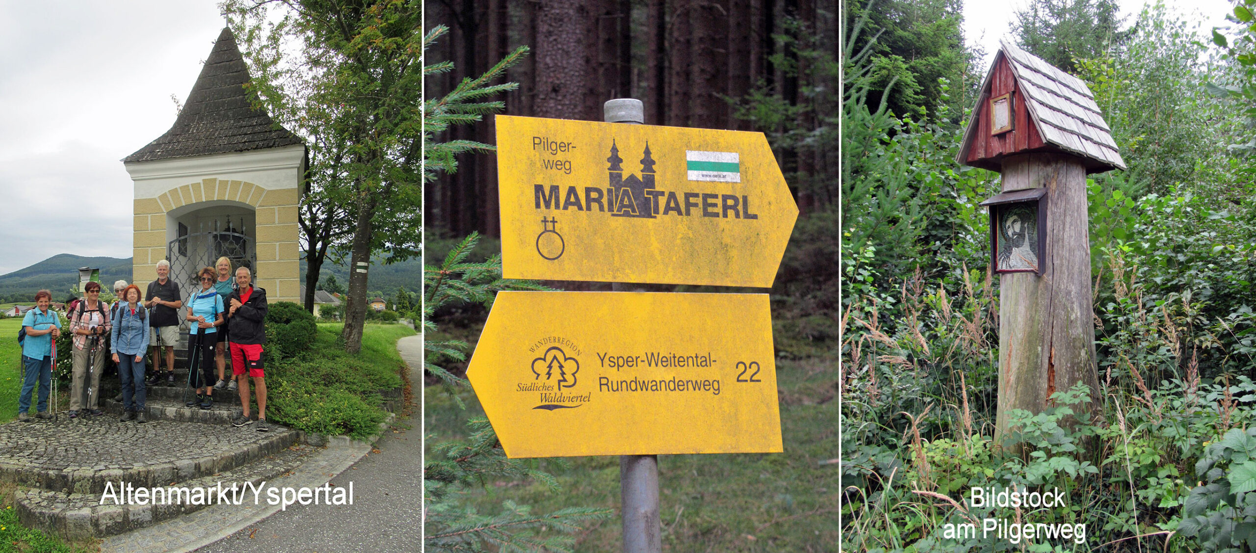 Angesagt ist ein Italientief mit breiter Regenfront. Soll man es wagen? – Ja, wir sind waghalsig und fahren bei feuchtem Wetter hinaus. In Ybbs schaut es bereits ganz anders aus, zwischen den Wolken leuchtet blauer Himmel durch. Wir fahren mit dem Bus durch das enge Yspertal nach Altenmarkt im Yspertal. Der gut markierte Wallfahrerweg nach Maria Taferl ist unser Tagesprogramm. Wir queren den südlichen Ostrong, machen beim Neuwaldhäusl nur kurze Rast, weil uns die Hunde verbellen. Kurz vor Grub grüßt uns kurz die Basilika von Maria Taferl, aber bis dahin ist es noch ein gutes Stück. Der ab Nachmittag angesagte Regen verspätet sich, trockenen Fußes nähern wir uns der Steinbachklamm. Wir verlassen nun den Wallfahrerweg und wandern durch die Klamm, das Rauschen des Wassers begleitet unseren Tritt. Bei der Winklermühle treffen wir wieder auf die Straße durch Schaufel. Nun ist es nicht mehr weit zu unserem Ziel, noch einmal bergauf, wir nehmen den steilen Anstieg an den Felsen vorbei und Maria Taferl ist erreicht. Der Blick ins Land von der Terrasse aus zeigt uns ringsum Regen an. Da haben wir wirkliches Wetterglück gehabt, stellen wir mit Freude fest. Im Kaffee Maria Theresia warten wir auf den Bus, Mohnstrudel mit Mohneis! Wir sitzen im Bus und der Regenschauer legt los – ja jetzt darf er es!