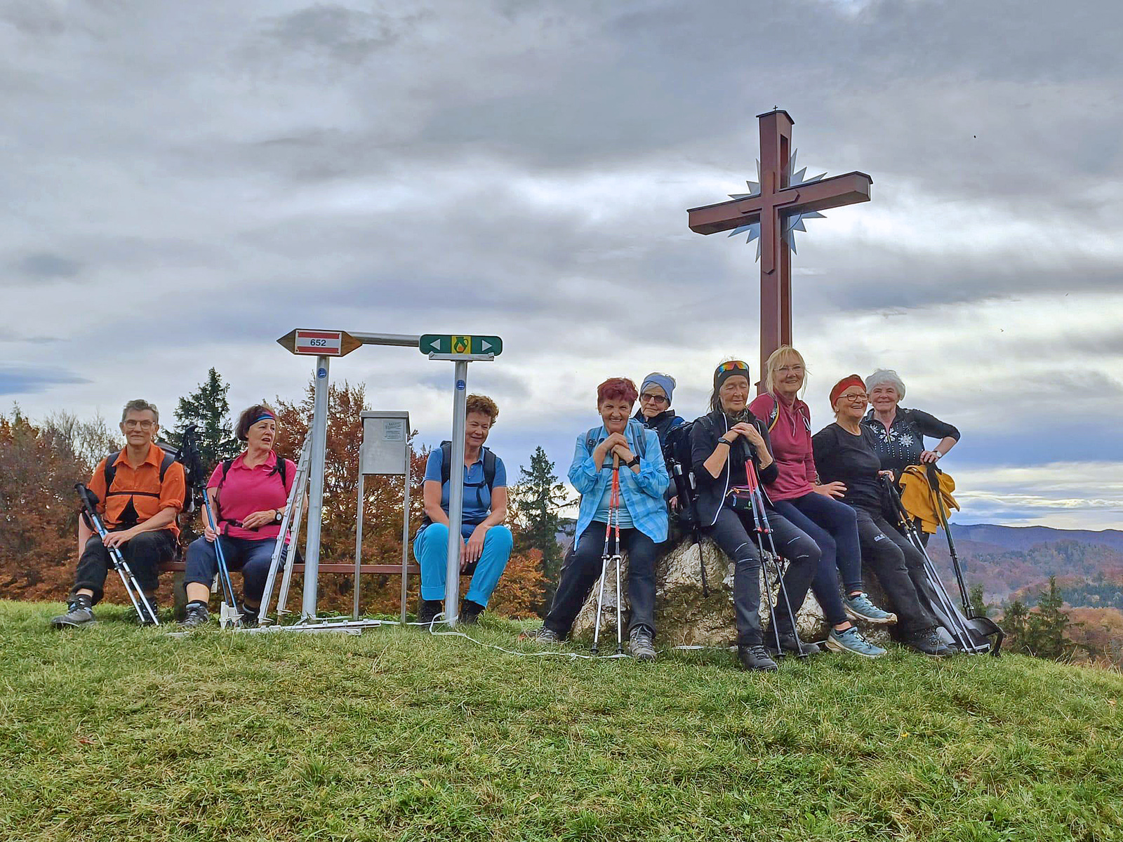 Trotz Ansage von Sturm und Regen starteten elf Tapfere – zehn Damen und ein Wanderführer – bei leichtem Nebel, aber gutgelaunt in Rabenstein an der Pielach. Je höher wir über laubbedeckte Wege nach oben stiegen, desto heller und wärmer wurde es. Supa! Bald sahen wir – teilweise nebelverhangen – die imposanten Überreste der Ruine Rabenstein. Durch ein gut erhaltenes Tor betraten wir das Innere. Kurze Pause auf dem Aussichtsturm und Richtung Sonne, die sich wider Erwarten immer mehr durchsetzte. Jetzt ging es entlang eines Höhenkammes auf und ab mit herrlicher Aussicht auf die Hügel des Alpenvorlandes, geschmückt mit vielen goldgelben und rötlich-braunen Bäumen und beeindruckenden Bauernhöfen. Die Josef-Franz-Hütte ließen wir links liegen und erreichten über Geiseben den letzten Anstieg zum Gipfelkreuz des Kaiserkogel. Eine ausgiebige Jause in der zum Glück geöffneten Kaiserkogelhütte war die richtige Belohnung für den doch ziemlich langen, aber wunderbar herbstlichen „Hatscher“. Der Abstieg führte über die Deutschbachmühle, die letzten 2 km leider auf Asphalt zurück zum Ausgangspunkt. Alle waren ziemlich groggy, aber auch sehr zufrieden und erfüllt.