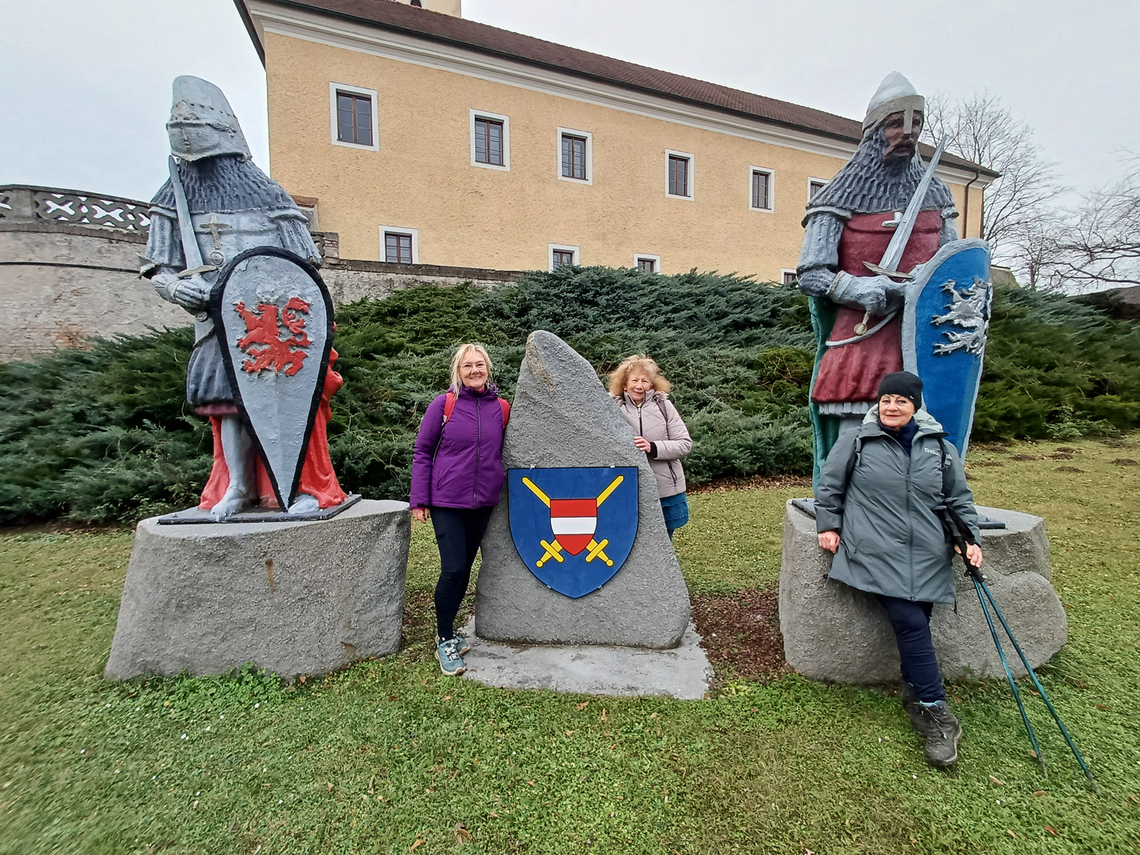 Bei kühlen Temperaturen und am Anfang starkem Wind wanderten wir 4 trotzdem gut gelaunt und weihnachtlich gestimmt durch die Straßen des schmucken Stillfried. Nach einer halben Stunde erreichten wir die Kirche des Ortes, die auf einem Hügel thront. Dann ging es wieder runter in den Ort und von dort über Wiesen und Felder mit herrlichem Rundumblick und die in leichtem Nebel liegenden Marchauen.Dabei gab es Infos zur historischen Schlacht von Dürnkrut, mit der die 600 Jahre dauernde Herrschaft der Habsburger in Östereich begann. Wir erreichten das idyllische Ebenthal mit seinem ebenfalls romantischen Dorfhügel samt Kirche. Ein imposantes Hirschgeweih vor einem dichten Christbaum wünschte uns Frohe Weihnachten. Eine kleine Pause mit wohltuendem heißen Tee im Windschatten einer Bushaltestelle war mehr als willkommen. Entlang von zum Glück dicht wachsenden Windgürteln stiegen wir in die Niederungen der Marchauen. Entlang des Sulzbaches erreichten wir Dürnkrut, wo uns 2 riesige Ritterskulpturen vor dem Tor zum Schloß empfingen.