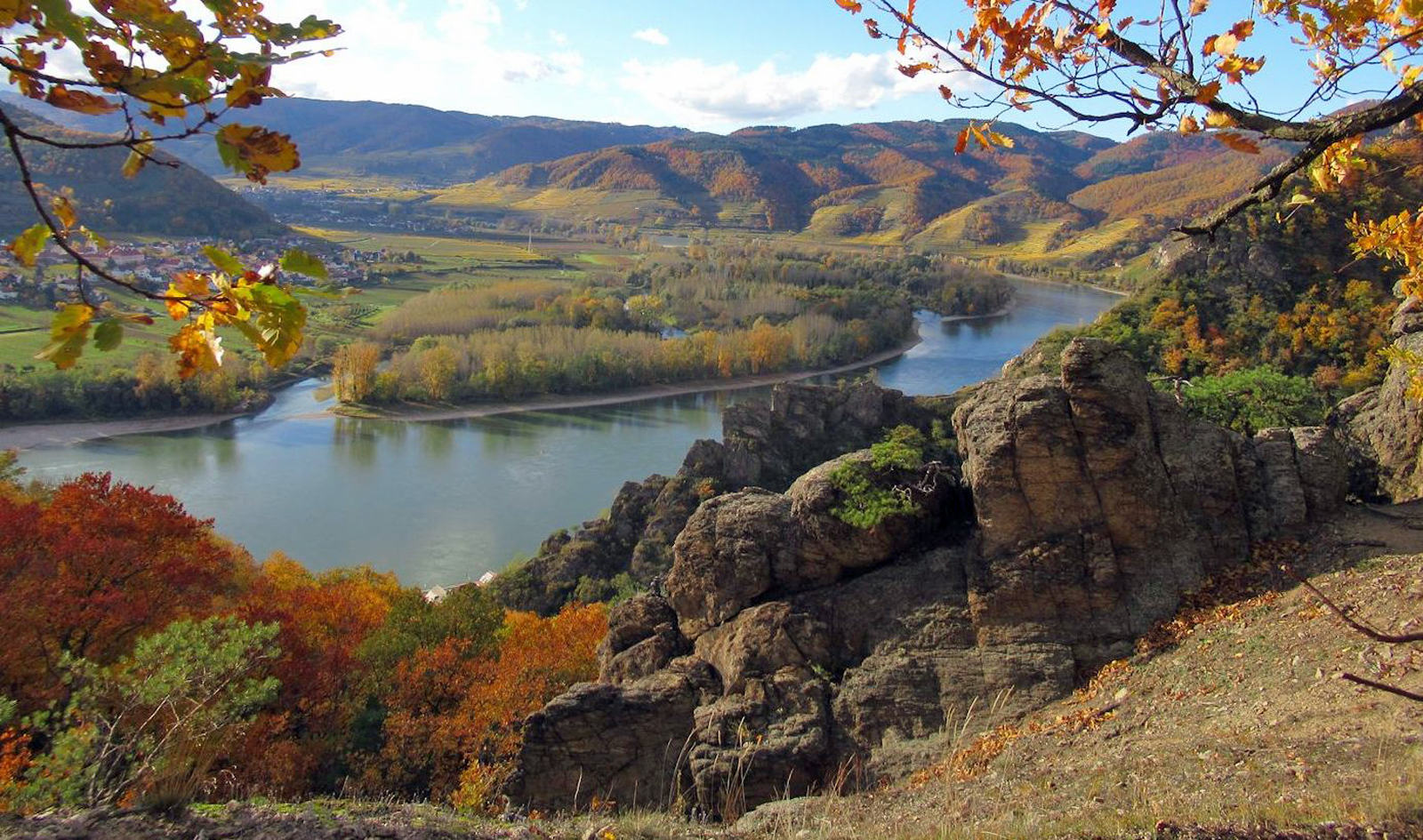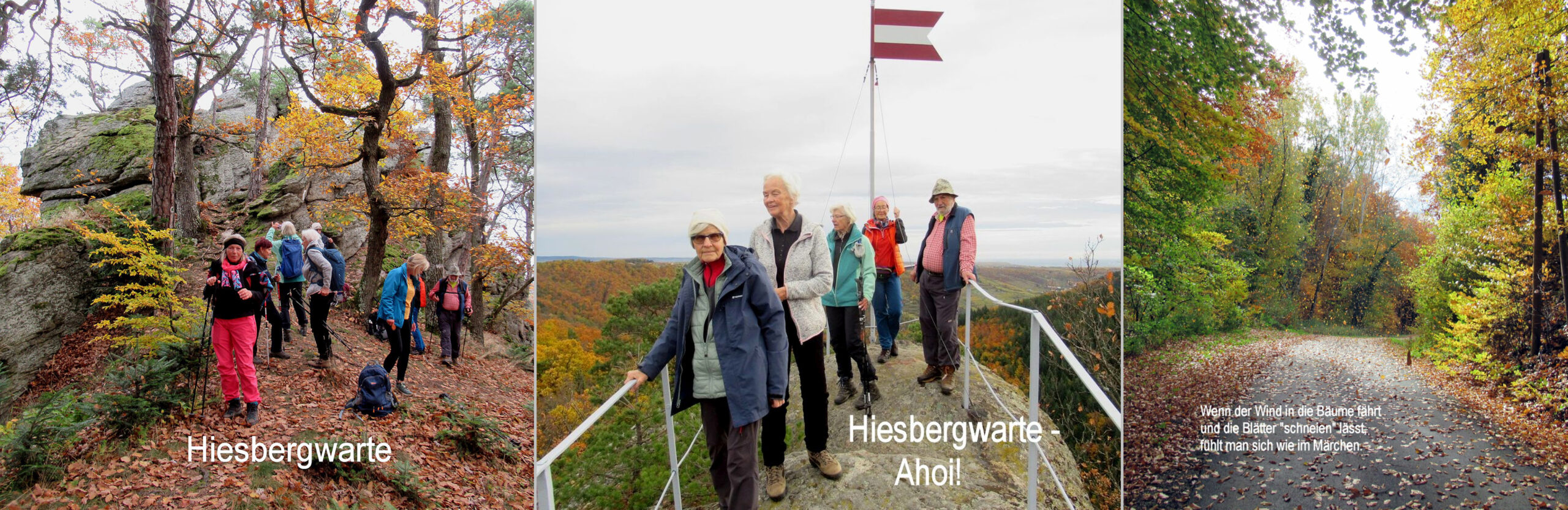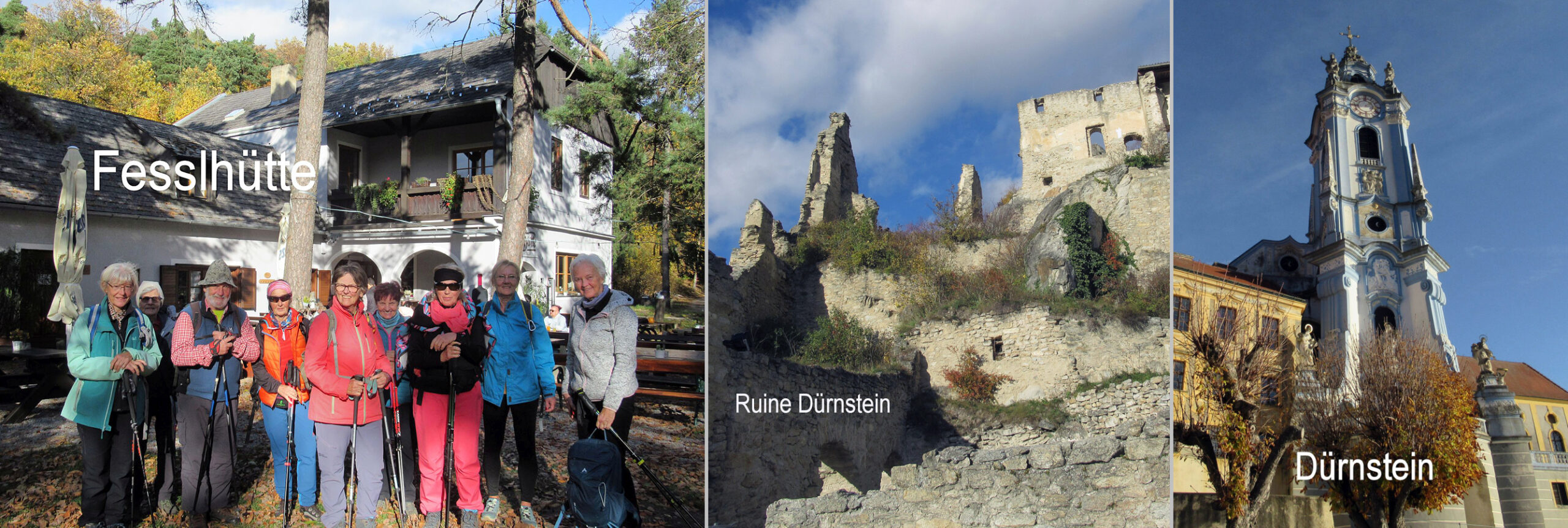 Senftenberg-Oberer Markt – gut gelaunt steigen wir aus dem Bus, das Wetter passt. Nach ein paar Schritten werden wir gleich gefordert: steiler Anstieg hinauf zur Hiesbergwarte, der Ausblick belohnt die Mühe, der Wald zeigt sich in bunten Farben, das Gelb der Eichen und Buchen dominiert, und wenn die Sonne durch die Wolken blinzelt spüren wir den Zauber des Waldes. Ein gutes Stück steigen wir noch bergan bis auf den Höhenrücken, wir müssen aber wieder hinunter ins Steinbachtal und machen beim Roten Kreuz Pause. Zum Florianikreuz geht es kommod bergauf. Auf der Höhe angekommen bläst uns Südwind entgegen, ein Stück Straße bis Scheibenhof, dann nimmt uns wieder der Wald auf. Die Fesslhütte ist unser nächstes Ziel. Wir sind überrascht, die Stube ist voll mit Gästen, wir nützen die noch freien Plätze und genießen die Mittagspause, freundliche und schnelle Bedienung. Inzwischen hat sich die Sonne durchgesetzt, wir steigen ab zur Ruine Dürnstein, der Weg ist freilich anspruchsvoll, aber die Ausblicke auf die Felsen des Vogelberges und ins Donautal sind traumhaft. Auf dem Weg hinunter in den Ort begegnen uns viele Ausflügler, die engen Gassen von Dürnstein, die vielen einladenden Stuben, die Kirchenfassade und ein Stück entlang der Donaupromenade – Eindrücke im Überfluss, aber der Bus, den wir erreichen wollen, wartet nicht.