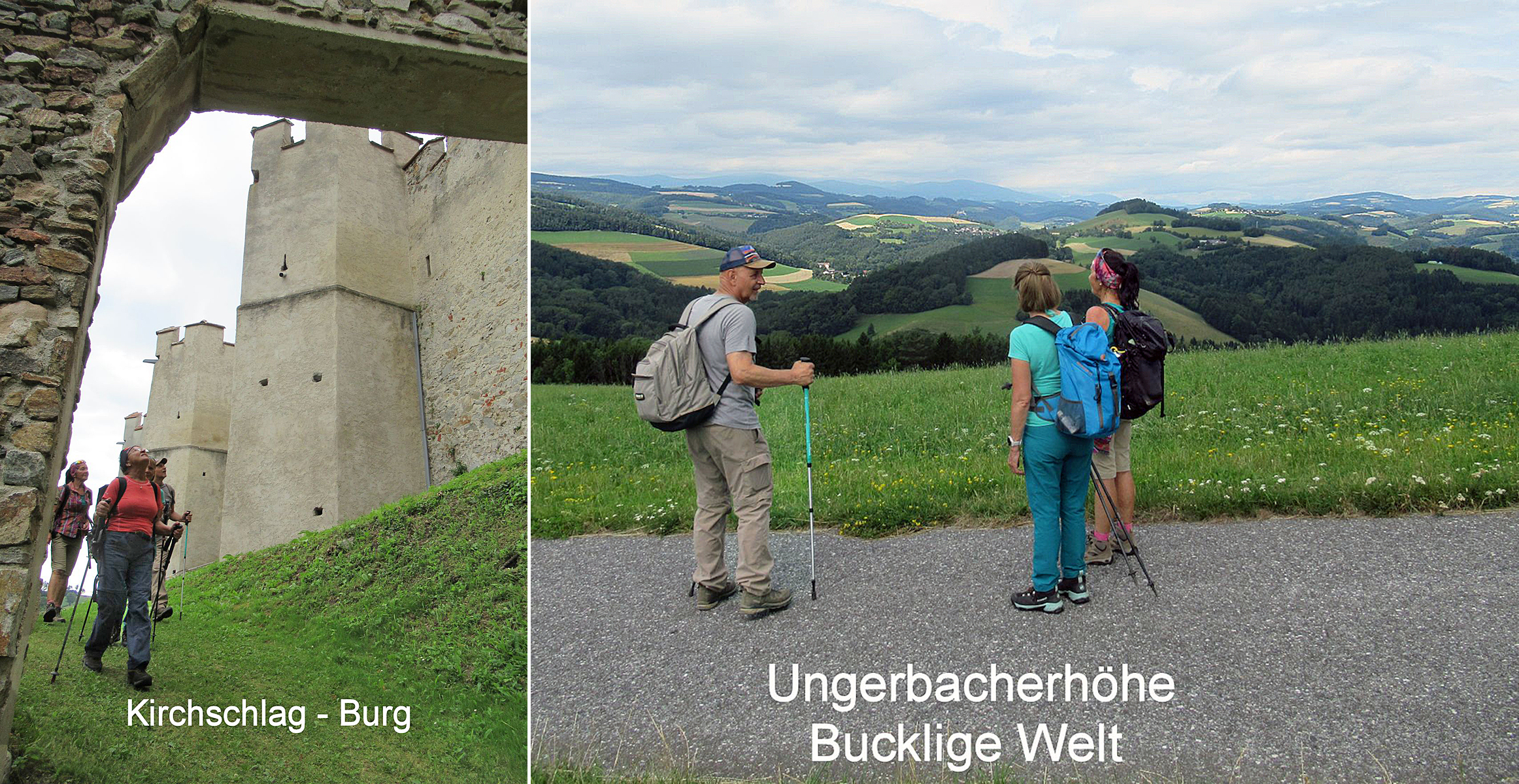 Im ersten Antritt erreichen wir 5 die Ruine Kirchschlag; es muss ein gewaltiges Bauwerk gewesen sein, die Mauern beeindrucken uns. Weiter geht es auf einem als MTB-Strecke ausgeschilderten Weg hinauf nach Niklasberg, bei angenehm kühlem Wanderwetter kommen wir aber dennoch ins Schwitzen. Die Aussicht auf die Bucklige Welt belohnt unsere Mühe bergab nach Ungerbach, wo wir erste Rast halten. Wieder folgt ein Anstieg hinauf nach Habich und Kalteneck. Dort machen Rast auf der Redelshöhe, ein künstlich aufgeschütteter Hügel als Aussichtsturm – „Gugelhupf“ genannt – mit einer rundumadum Aussicht, eindrucksvoll, wir genießen es. Den Steinstückl in Sicht – ein aussichtsloser Berg, 833m hoch – deswegen umwandern wir ihn und gehen auf den Kienberg zu. Nach einem kurzen Anstieg erwartet uns ein Gipfelkreuz mit Rastplatz. Beim Abstieg verlieren wir die Markierung, aber mit Handyortung gelangen wir wieder auf den markierten Steig hinunter nach Bernstein. Beim Tennisclubhaus bietet sich eine Bierpause an, die wir gerne annehmen. Anschließend bequeme Heimfahrt mit den Burgenlandbussen B14 nach Oberwart und B9 nach Wr. Neustadt. Die Details: 16km in 5 Stunden und +/- 700 Höhenmeter.