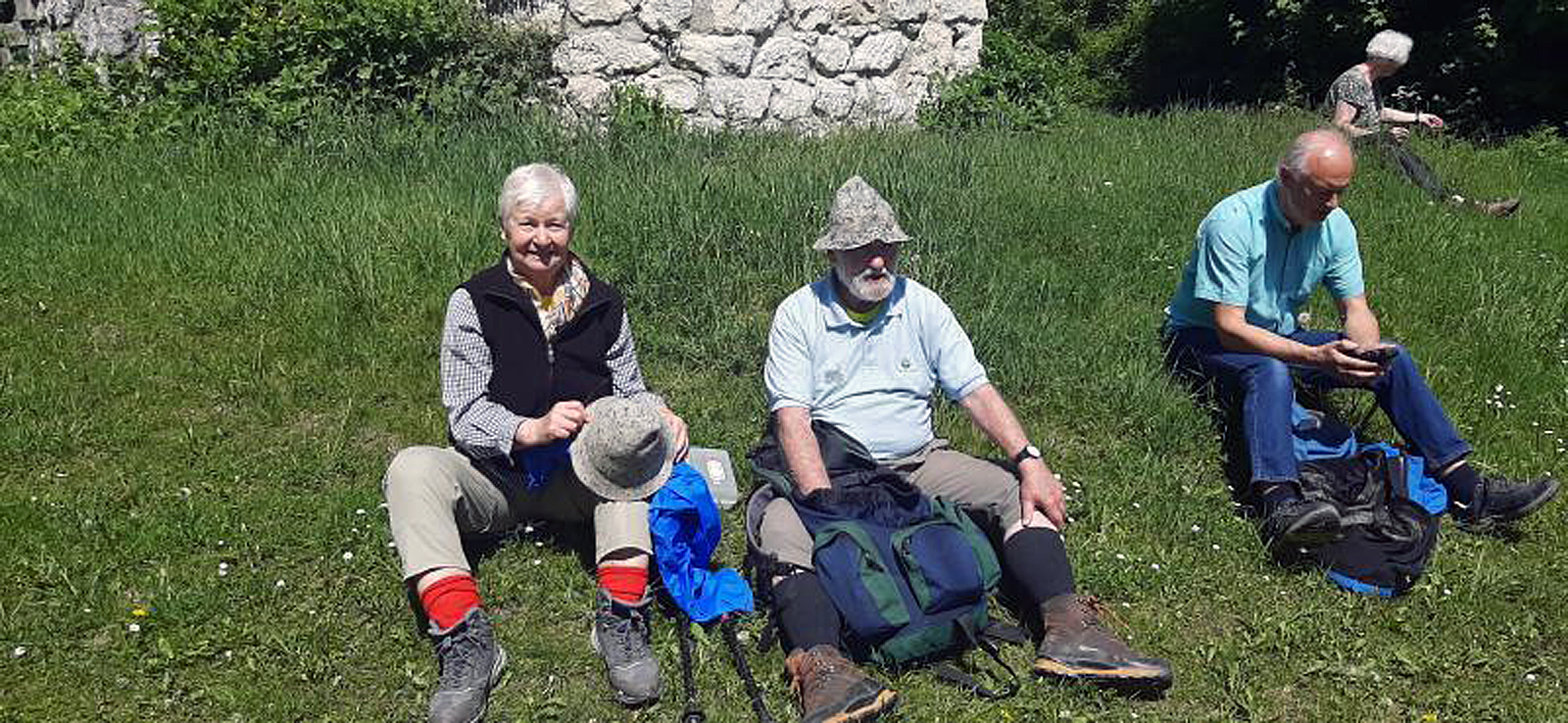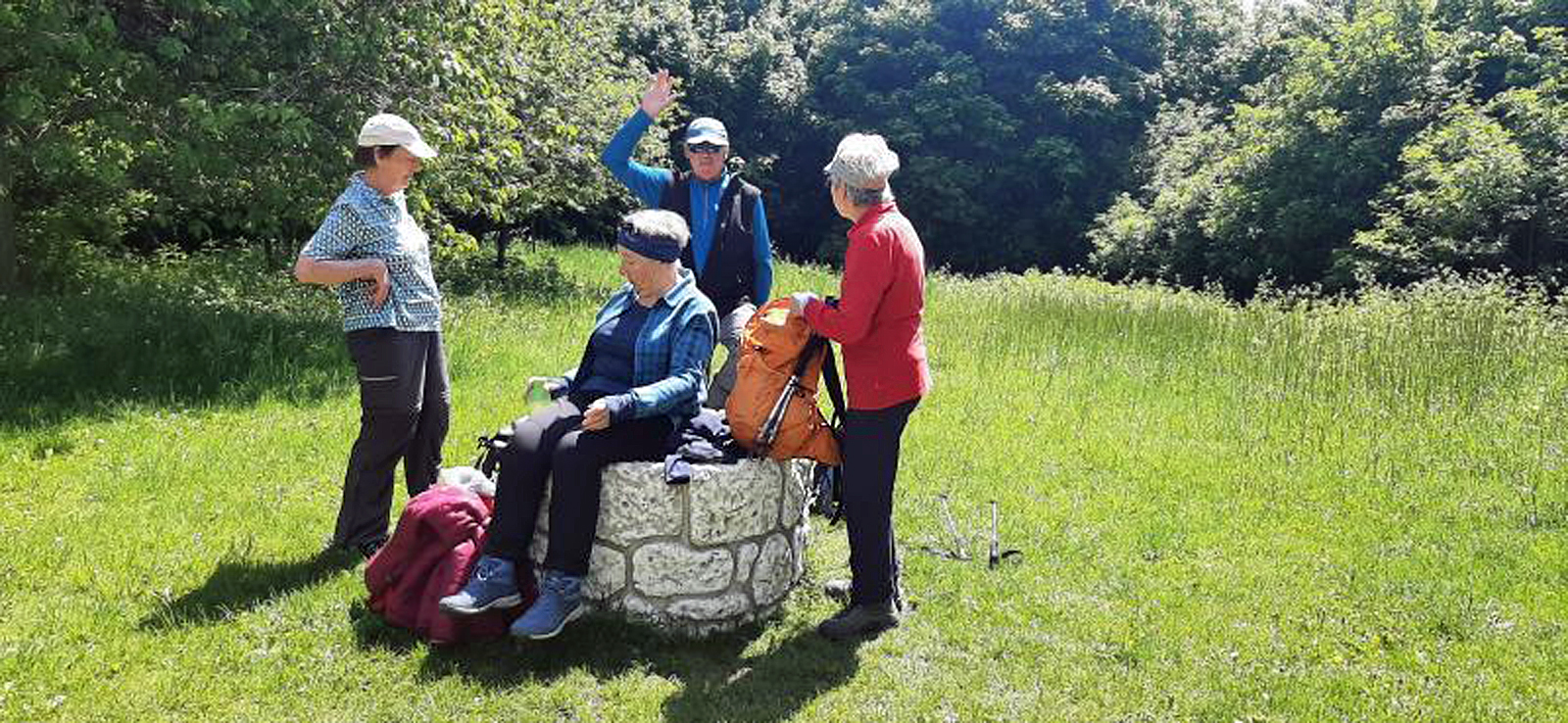 ei bestem Wanderwetter treffen einander 10 Teilnehmerinnen und Teilnehmer am Bahnhof Meidling, um per Bahn über Ebreichsdorf und Bus zum Start beim Gasthof Arbach-Mühle, nahe Hof, zu gelangen. Ein Weg durch recht verwachsenen, ungepflegten Wald führt uns zum Kloster Sankt-Anna in der Wüste. Das Kloster ist geschlossen. Wir nehmen eine der 3 Varianten – die teilweise sehr gatschig sind – hinauf zur Franz-Josef-Warte, um dort in der Sonne zu verweilen. Die Fernsicht ist heute leider nicht optimal, aber eine nette Mitwanderin verteilt zu viel mitgenommenes Obst und Kuchen. Der zweite Teil der Tour geht nur mehr bergab, ist aber schlecht markiert und wir landen in einer Sackgasse. Müssen deshalb recht beschwerlich und wild bergab zu einem V-förmigen Tal, von wo aus der Weg wieder richtig zum Ortsende von Donnerskirchen führt. Rasten noch kurz bevor wir die dann endlos scheinenden 2½ Kilometer der Ortsstraße in Richtung Bahnhof in Angriff nehmen. In LYDIAs Garten kehren wir noch kurz ein und mit dem Zug um 15:41h folgt die über 2½ Stunden lange Heimreise über Bruck an der Leitha nach Hause. Gesamt 4½ Stunden, 11 Kilometer, +260 / -350 Höhenmeter