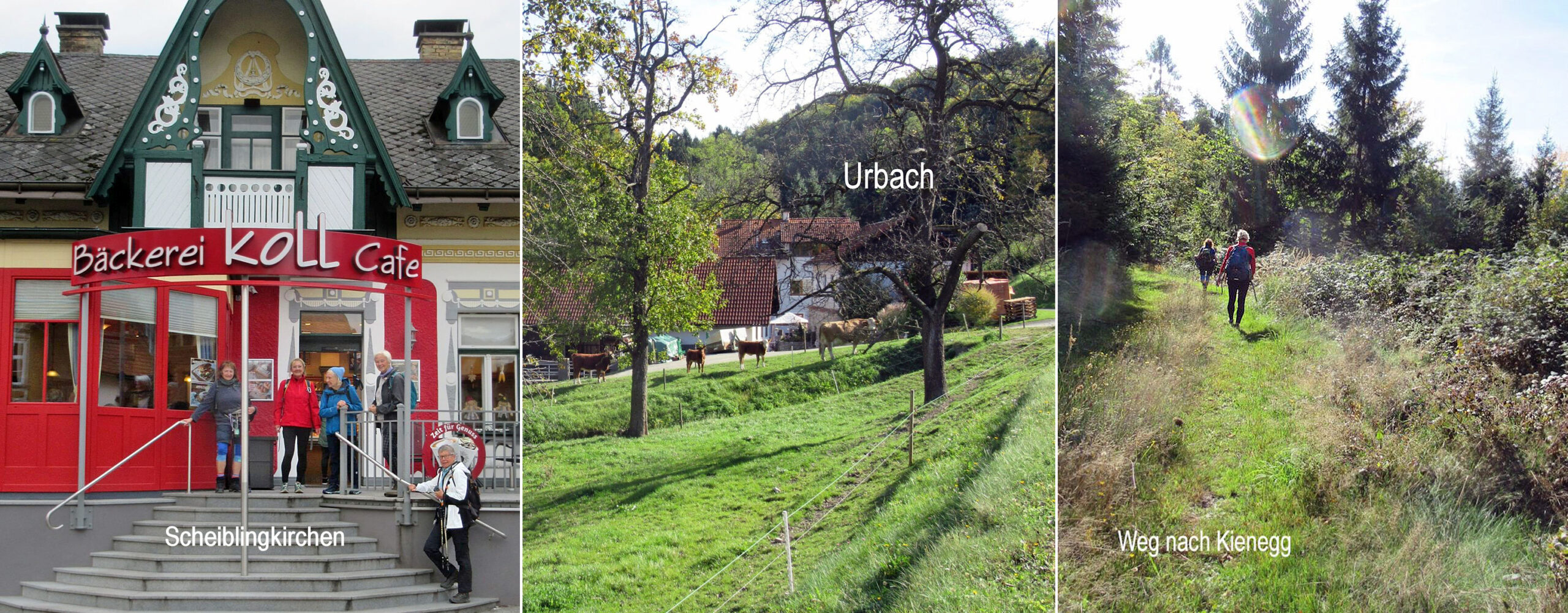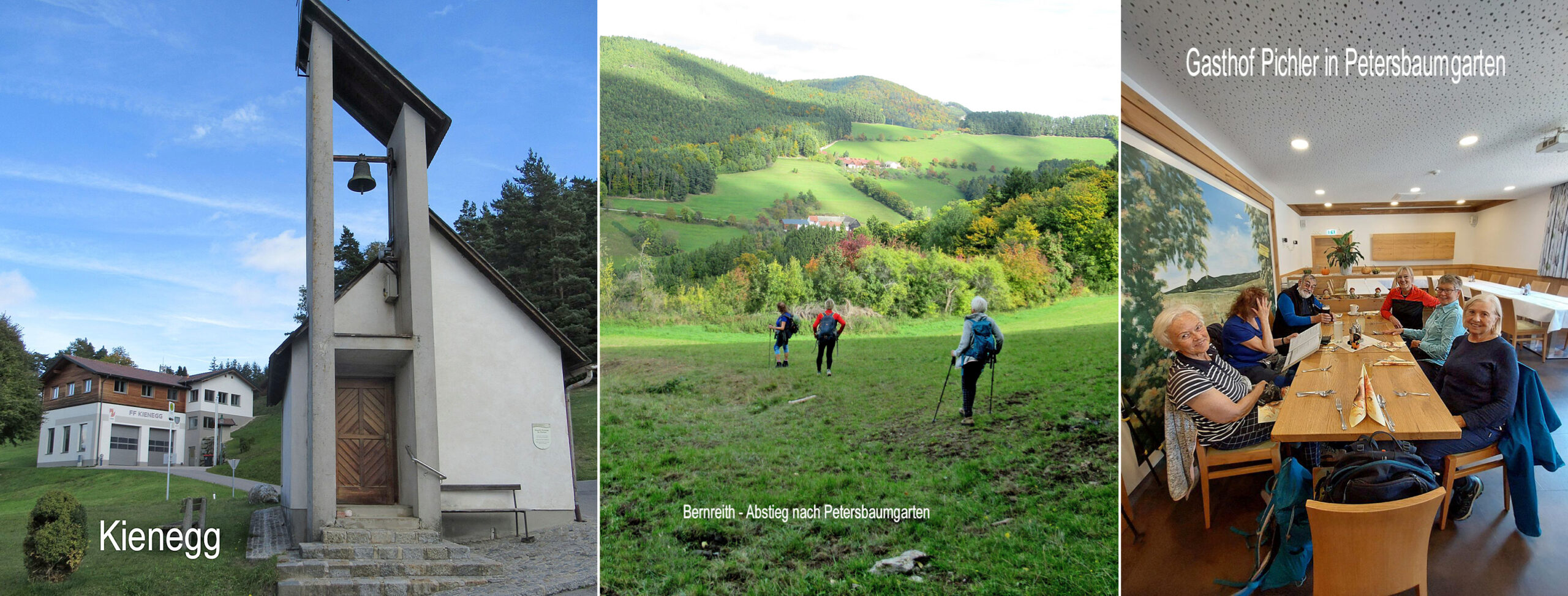 Der Neumüller in Kaltenberg hat den Gasthausbetrieb eingestellt, der Thaler in Thernberg ist ausgebucht, nur der Pichler in Petersbaumgarten hat einer Einkehr zugesagt. Wie geplant beginnen wir unsere Tour in Scheiblingkirchen, diesmal bei der Bäckerei Koll, umkreisen die Kirche und machen uns auf den Weg hinauf nach Kaltenberg. Ein steiles Stück im ersten Anstieg fordert all unsere Kraft in den Beinen, aber bald geht es bergab nach Ofenberg. Wir bewundern einen Küchengarten und plaudern mit der Hausfrau, während uns Hund Willi neugierig umkreist, denn Wanderer kommen dort nicht vorbei. In Urbach machen wir Pause und mühen uns dann hinauf nach Kreuth. Bald stoßen wir auf den Wanderweg nach Kaltenberg, aber Kaltenberg hat unsere Präferenz verspielt, so wenden uns gleich nach rechts und gehen auf Kienegg zu, lohnend die Aussicht. Bei der Kapelle rasten wir. Für Edith organisierte Theo eine Fahrgelegenheit ins Tal, die restliche Gruppe folgt der Markierung nach Petersbaumgrten. Im Gasthaus Pichler treffen wir wieder zusammen, stärken uns und fahren trotz sonnigem Nachmittag gemeinsam nach Wien. Denn die Tour war ein „1a-Weg“ meinen alle, den kann man heute nicht mehr toppen.