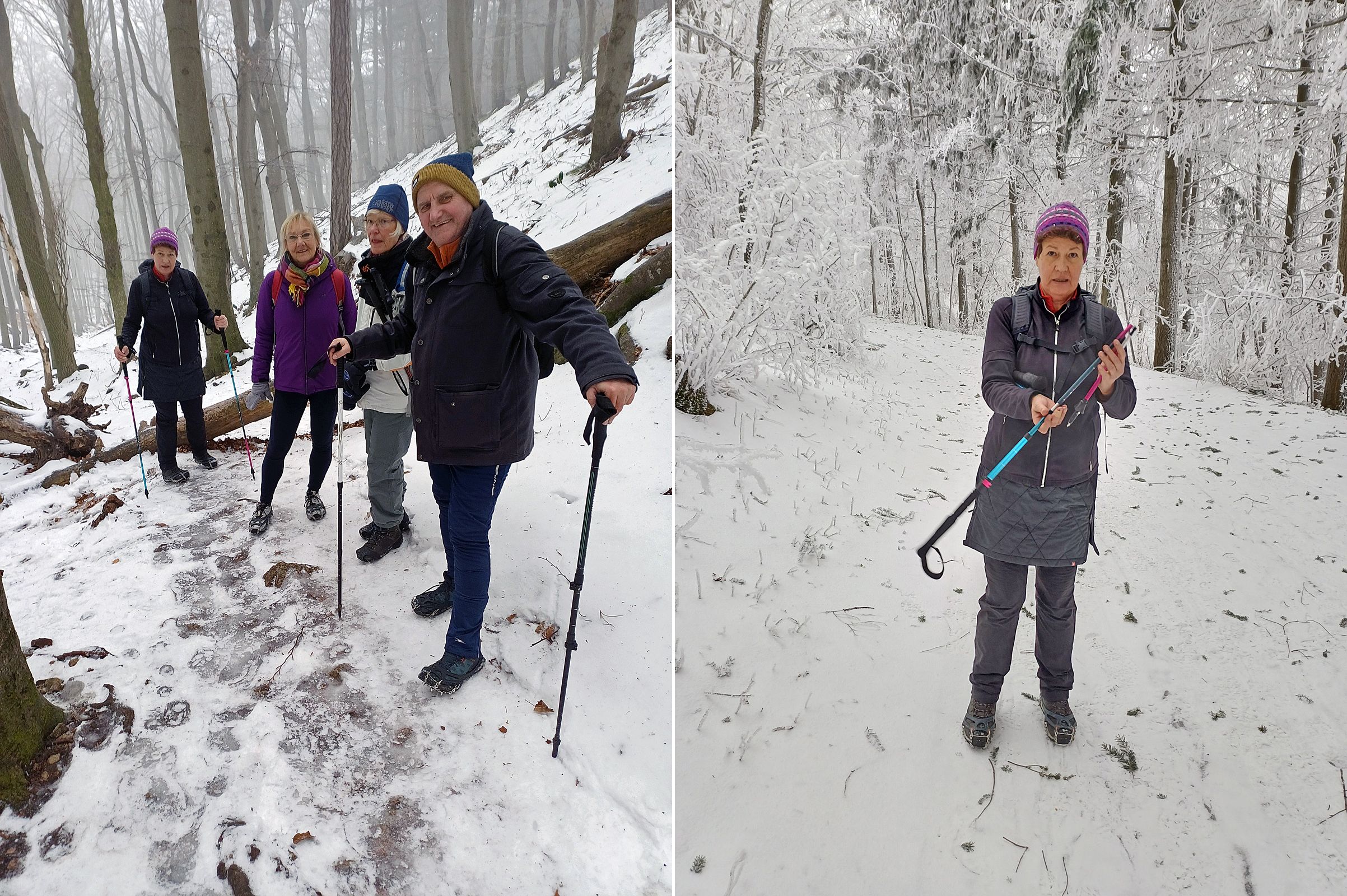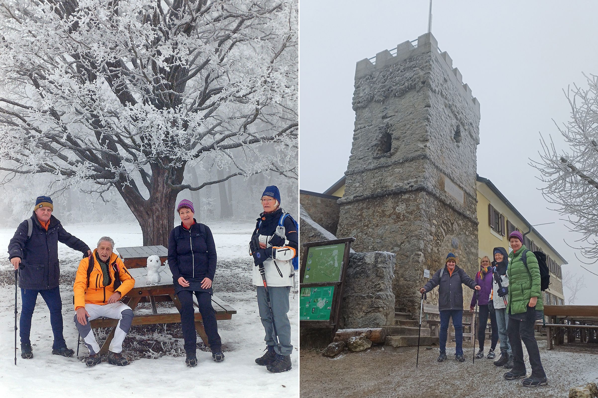 Trotz tiefer Temperaturen und eisiger Bedingungen fanden sich 4 Wanderfreudige in Kaltenleutgeben – der Name passte echt – ein. Grödeln waren von Anfang an unerlässlich. So konnten wir das erste Steilstück zum völlig zugefrorenen Kaltenleutgebenersee sicher überwinden. Je höher wir stiegen, desto mehr umgab uns eine märchenhafte Winterlandschaft. Zentimeterlanger Raureif schmückte das kleinste Asterl an jedem Baum und Strauch. Alles war in herrliches Weiß gekleidet, der Boden mit einem Schneeteppich bedeckt und die Wege pickelhart mit Eis belegt. Aber die Grödeln……. Supa! Ab der Kammersteinerhütte, die wir links liegen ließen, begann das Wandeln in einer winterlichen Märchenlandschaft auf ziemlich ebenen, breiten Wegen. Aber auch hier knirschte das Eis unter den Füßen. Über die Weite der Kugelwiese und Seewiese erreichten wir hocherfreut das Höllensteinhaus, wo wir ein gemütliches Mittagessen in der Wärme genossen. Schon gewohnt an die Minustemperaturen ging‘s weiter. Aber nur noch bergab, was bei der Rutschgefahr auch nicht ohne war. Mit roten Gesichtern, sehr erfreut über die tief winterlichen Bedingungen des Wienerwaldes – wann war das das letzte Mal? – erreichten wir rechtzeitig Kaltenleutgeben, wo uns der Bus wie bestellt zurück nach Liesing und nach Hause brachte. Unvergessliche Winterfreuden!