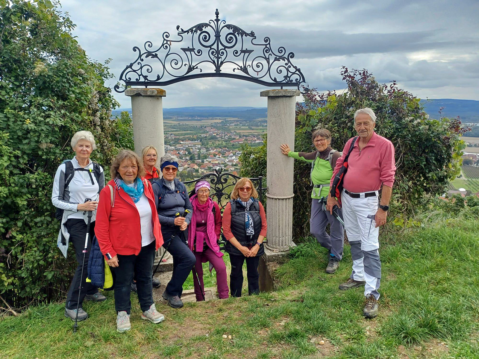 Kurz nach dem Bahnhof empfingen uns schon die Weinberge, die uns die nächsten Stunden begleiten sollten. Entlang teilweise leerer, weil abgeernteter, teilweise mit üppigen weißen und roten Weinreben dicht behängten Reihen von Weinstöcken fanden wir unseren Weg auf den fast labyrinthischen Wegen entlang des Wagram. Erste Rast am „Gipfel“ (303m) des Gobelsberg, wo uns eine Aussichtswarte mit herrlichem Ausblick auf das Donautal erwartete. Ein klassischer Hohlweg, links und rechts mit den charakteristischen Löswänden führte uns wieder ins Tal nach Gedersdorf, wo uns ein wunderbares Mittagessen erwartete. Wieder etwas steiler ging es erneut nach oben auf den Rücken des Saubühels mit erneut herrlichem Ausblick auf das gesamte Donautal, über allem Stift Göttweig thronend. Von einem sonderbaren Schmeideeisentor zwischen 2 klassischen Säulen erfuhren wir, dass es auch „Heinz Konrad“ Tor genannt wird. Das war der Beginn des Abstiegs über den Hauersteig entlang einer Stufe des Wagram mit steilen Felsvorsprüngen über uns.  Von nun an war unsere variante des Jakobwegs flach und führte entlang zahlreicher Weinkeller bis ins  Zentrum von Krems. Kaffee und Torte rundete die wunderbare Wanderung trotz bedecktem Himmel, aber mit angenehmen Temperaturen durch die Weinberge am Wagram gebührend ab.