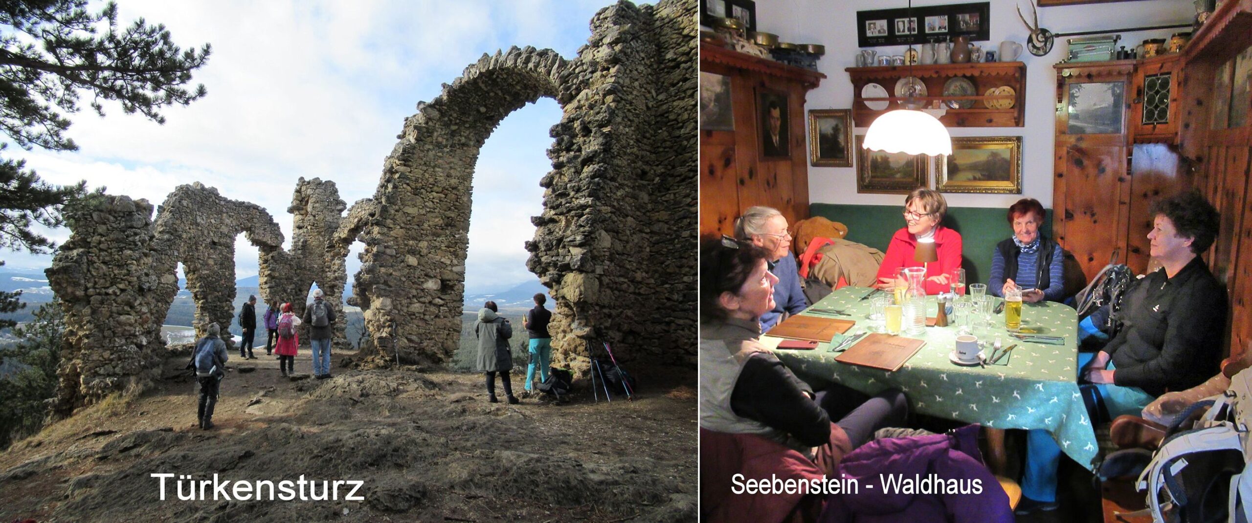 Das trostlose Grau hält uns schon zu lange im Griff, dazu die Kälte, die den Boden gefroren hält, das geringe Wanderangebot der vergangenen Woche – Alles muss raus, so die Devise für die 21! Wanderfreudigen. Von der Kirche in Scheiblingkirchen starten wir los. Schon der Anfang des Leit´n-Weges macht uns klar, ohne Grödeln geht nix. Ketten anlegen mit gegenseitiger Unterstützung. Bald verabschieden sich zwei, sie fühlen sich ein wenig überfordert. In Innerschildgraben ändert sich die Situation, wir wechseln auf die Sonnseite, alles aper, bergauf geht es nun nach Weingart. Die Sonne zeigt sich, Frühlingsgefühle kommen auf, da wird uns warm nicht nur ums Herz. Nach Sollgraben hinüber sind die Wege teils recht tief, einige eisige Stellen überwinden wir problemlos. Auch weiter zum Türkensturz kommen wir flott voran, genießen von der markanten, mit Ruinen bestückten Felsnase im Pittental die Aussicht bis zum wolkenverhangenen Schneeberg. Wir haben Hunger.…der Weg nach Seebenstein zwingt uns wieder die Grödeln anzulegen, eine einzige Eisplatte bis hinunter zum Ort. Nach vier Stunden belohnen wir uns mit der Einkehr im Waldhaus, in der warmen Stube sitzen wir ab, unter Krickeln, alten Bildern und Versatzstücken. Auch das Speisenangebot gefällt uns, gut und rasch kommt es aus der Küche – unerwartet so ein Wanderabschluss, wo der Wirt noch gerne mit den Gästen plaudert.